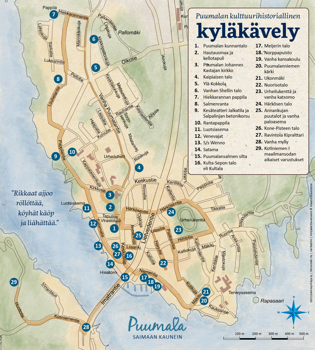 Puumalan kyläkierros tarjoaa kiehtovan aikamatkan vaihtelevassa maisemassa. Kätevä kartta esittelee reitin varrella 29 mielenkiintoista ja kulttuurihistoriallisesti merkittävää kohdetta! Voit aloittaa ja päättää retin haluamastasi pisteestä. Reitti sopii myös tunnelmointiin ja rauhalliseen kävelyyn ystävien tai perheen kanssa – äläkä unohda ottaa kuvia muistoksi matkan varrelta!